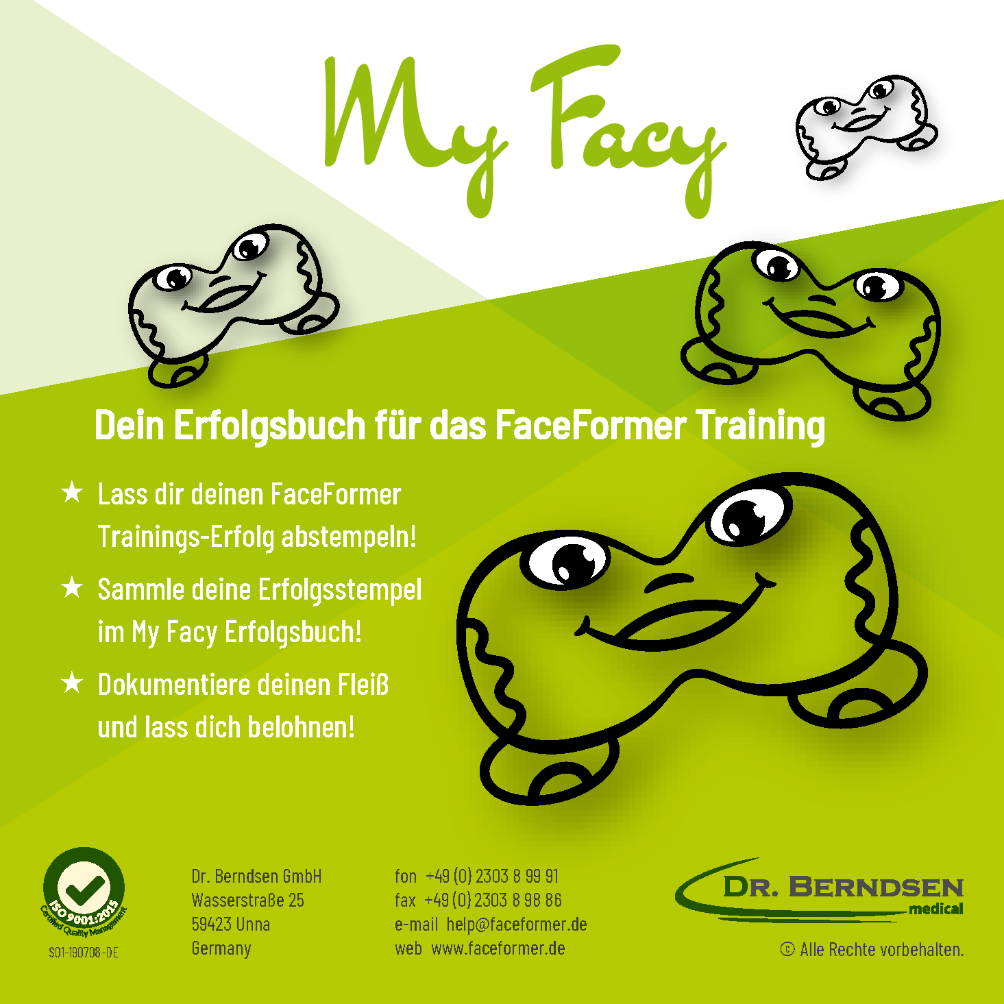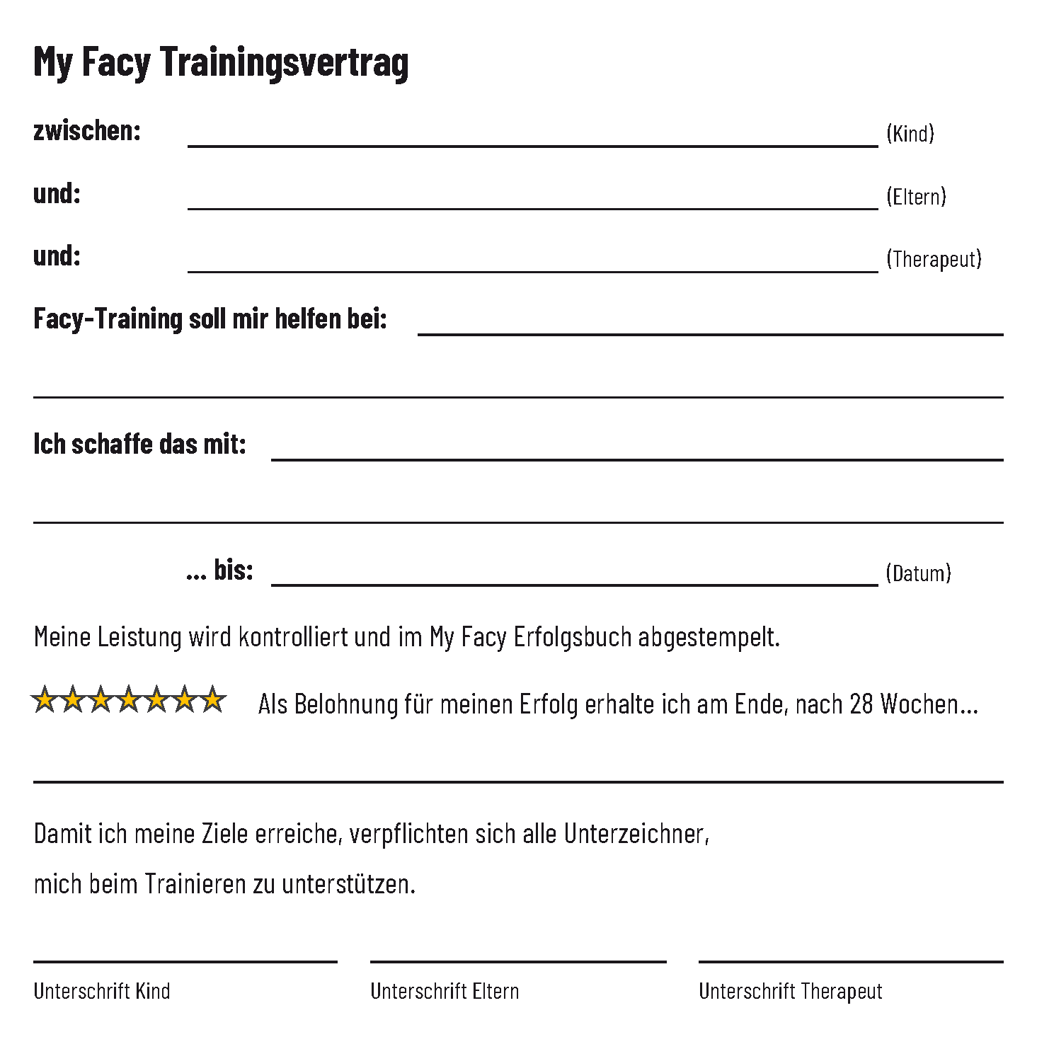 The success of the FaceFormer therapy stands and falls with the training. Consistent execution of the exercises is important for success. However, especially with children, the lack of motivation often stands in the way. So we created the My Facy Success Book to help keep them motivated. In the Success Book, rewards are contractually agreed between the child, parents and therapist. A goal and a special final reward after reaching the goal are recorded. In addition, smaller sub-rewards can be set for each week and each month. For each workout per day, the child will receive a My Facy stamp in the Achievement Book. When the week or month is stamped, the child receives their reward. The rewards should be based on the child's preferences so that they can be effective. You can find some suggestions for rewards in our newsletter Easier and still train properly .